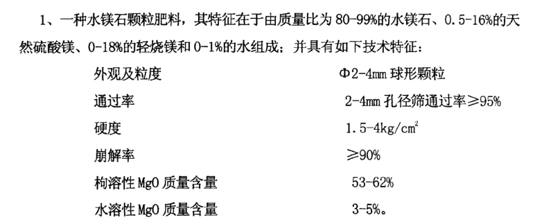 水鎂石顆粒肥料,是將水鎂石、天然硫酸鎂和輕燒鎂混合,用水或者5%(質量)的檸檬酸溶液做粘合劑,經物料混合、造粒、干燥和包裝步驟制得的直徑φ2-4mm球型顆粒,其中:水分質量含量≤1%、硬度1.5-4kg/cm2、崩解率≥90%、枸溶性5%。本產品為純天然產品,顆粒圓潤,均勻,硬度高,崩解性好,與其他肥料混合時,便于混伴均勻,減少粉末污染和減少浪費。
